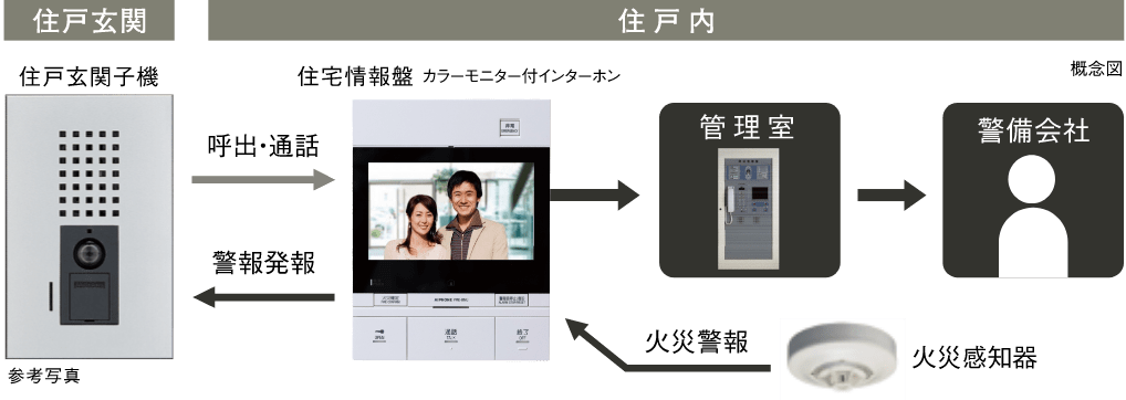 火災発生時など、万が一の場合でも、多種・多様な警報機能の連携により、迅速な対応を実現。例えば、住戸内での火災時は出火階とその直上階へ警報を通知します。